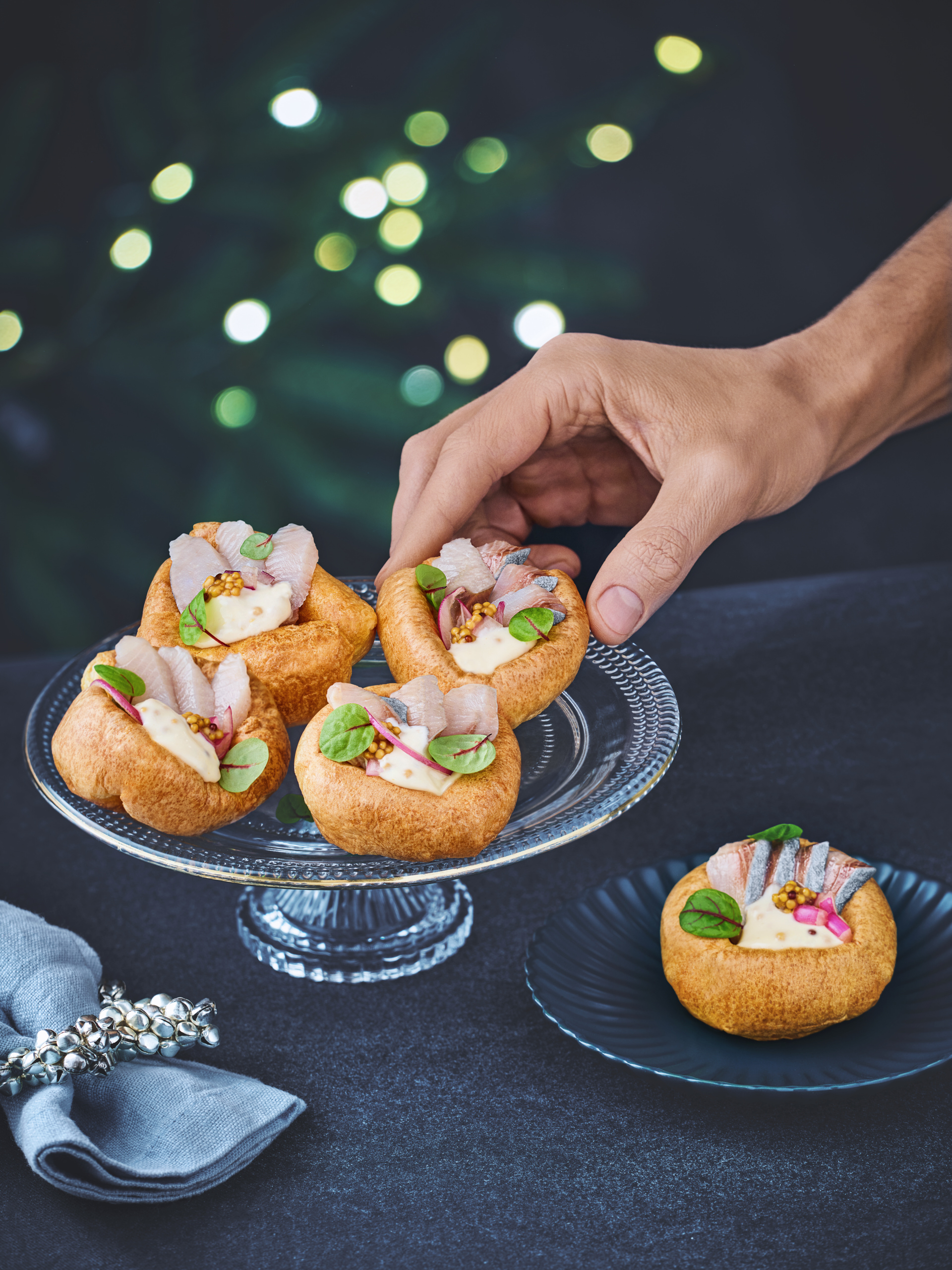 Йоркширский пудинг с сельдью и маринованным луком