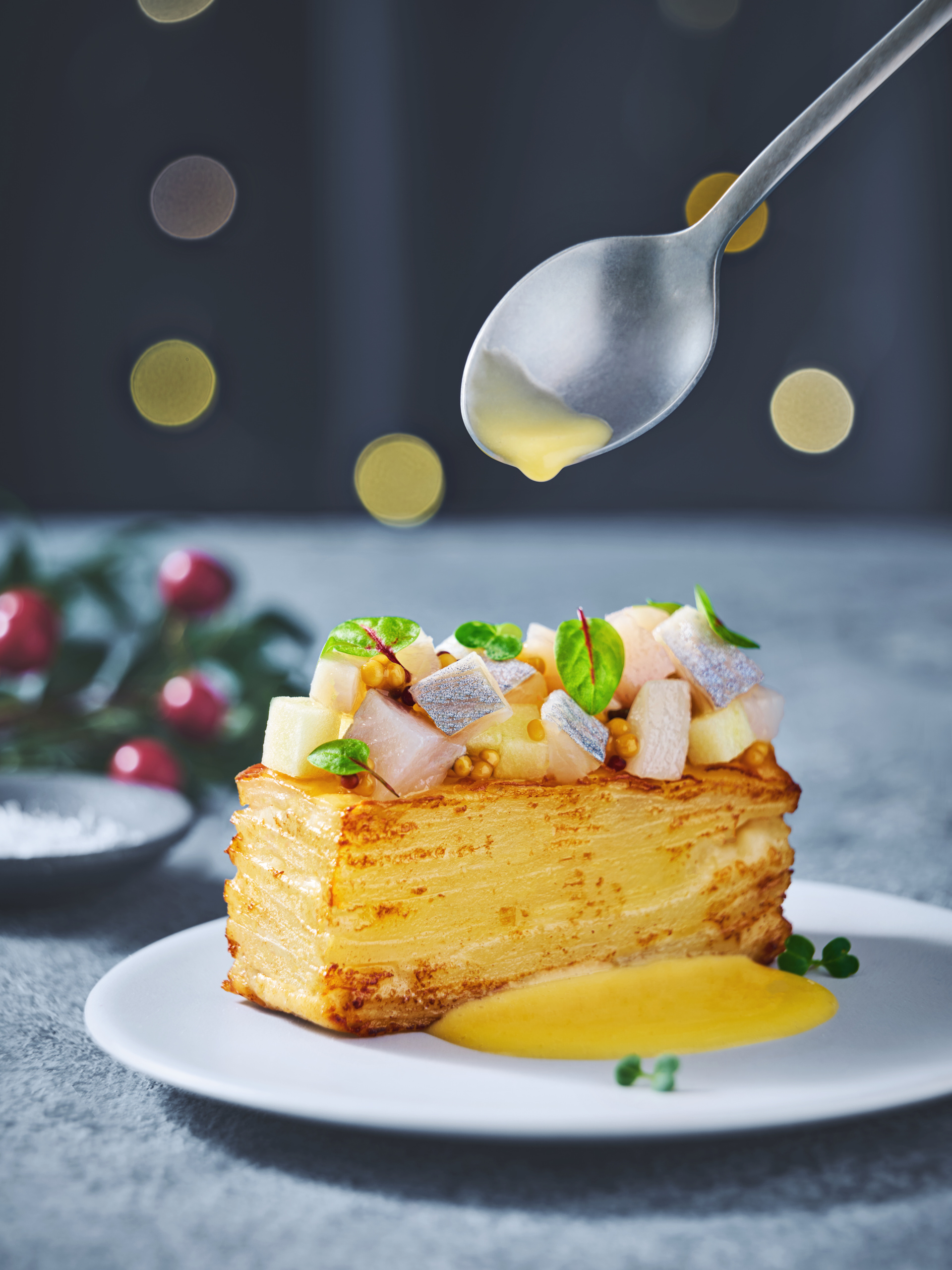 Картофельный гратен с сельдью и голландским соусом