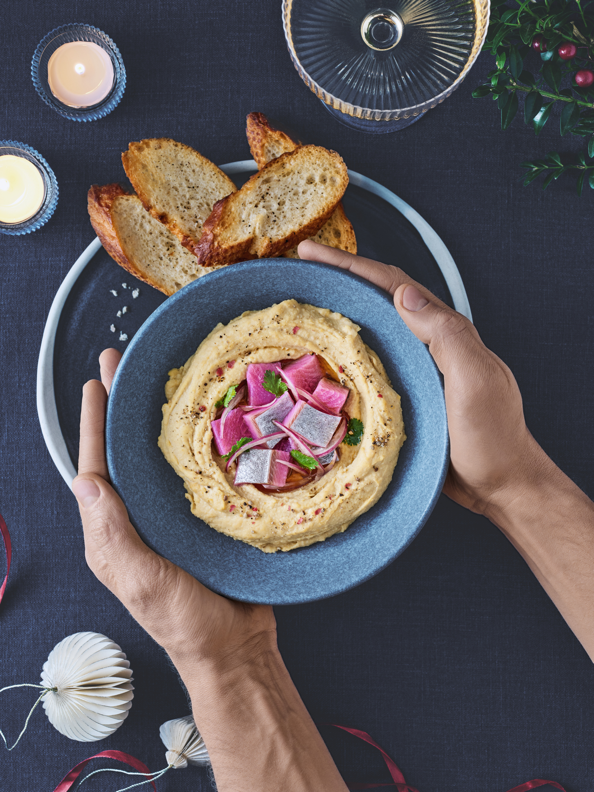 Домашний хумус с сельдью и чесночным багетом
